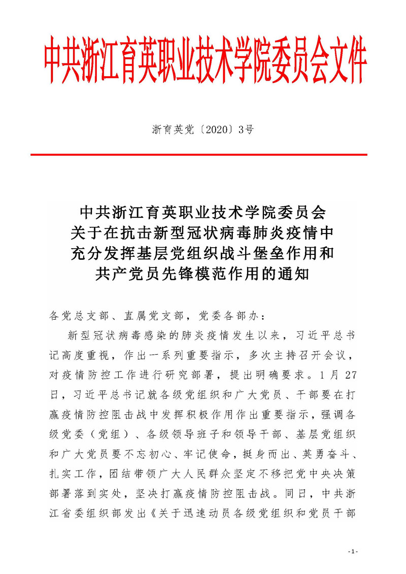 中共浙江育英职业技术学院委员会关于在抗击新型冠状病毒肺炎疫情中充分发挥基层党组织战斗堡垒作用...