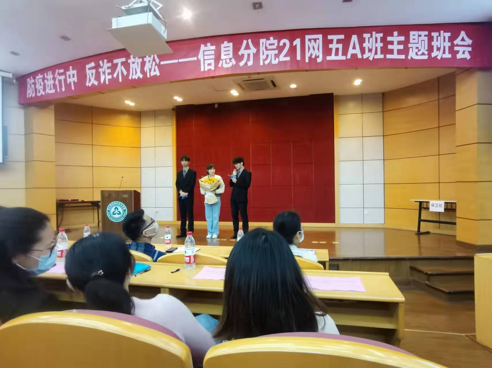 班会主题为“防疫进行中,反诈不放松”,同学们通过视频、案例反思、新冠抗原检测讲解、小品表演、脱口秀、反诈骗测试、反诈秘籍、歌曲表演等形式,将“防疫”与“反诈”结合起来,形式多样,趣味盎然,寓教于乐。同学们能将身边的事情与搜索的案例进行进行精心设计,表演逼真,富有感染力,台上台下互动频繁,气氛热烈。