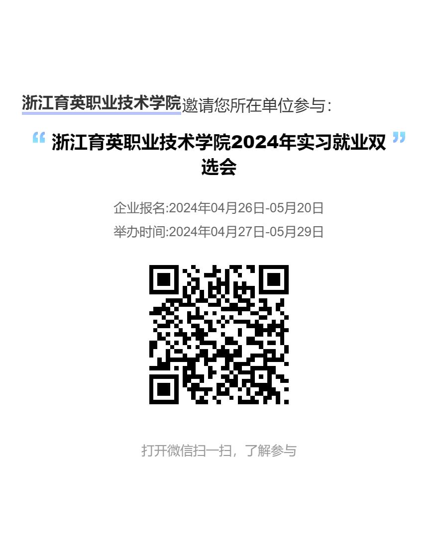 企业方通过微信扫码的方式(详见图1)预约报名,登录“校友邦”平台(www.xybsyw.com)按要求发布具体招聘信息。(注:请招聘企业在“招聘岗位”后注明“实习岗位/就业岗位/实习就业亦可”,三选一),并在“在线双选会”中报名“浙江育英职业技术学院2024年实习就业招聘会”专场招聘会,审核通过后自动加入招聘会。