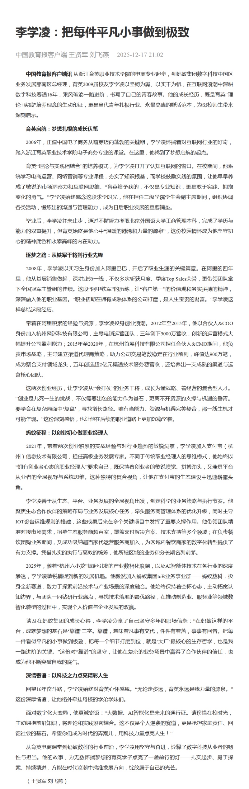 中国教育报客户端讯 从浙江育英职业技术学院的电商专业起步,到蚂蚁集团数字科技中国区业务发展部南区总经理,育英2009届校友李学凌以坚韧为翼、以实干为帆,在互联网浪潮中深耕数字科技赛道16年,乘风破浪一路进阶,书写了自己的青春故事。他的成长经历,既是育英“理论+实践”培养理念的生动印证,更是当代青年扎根行业、永攀高峰的鲜活范本,为母校师生带来深刻启示。
