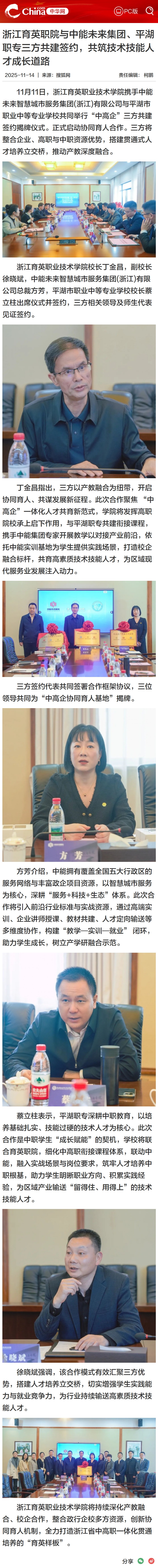 11月11日,浙江育英职业技术学院携手中能未来智慧城市服务集团(浙江)有限公司与平湖市职业中等专业学校共同举行“中高企”三方共建签约揭牌仪式。正式启动协同育人合作。三方将整合企业、高职与中职资源优势,搭建贯通式人才培养立交桥,推动产教深度融合。