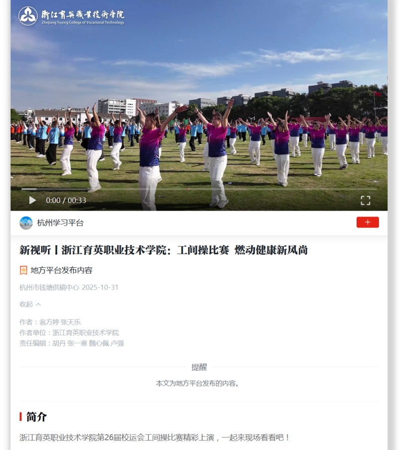 【学习强国】新视听丨浙江育英职业技术学院:工间操比赛 燃动健康新风尚