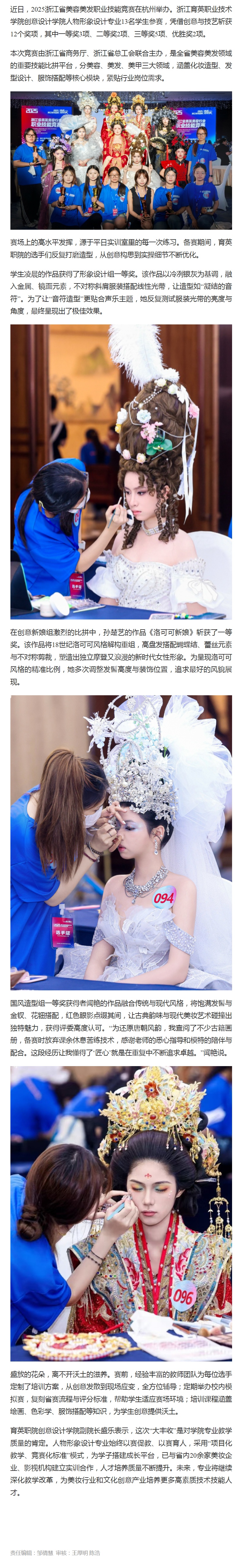 近日,2025浙江省美容美发职业技能竞赛在杭州举办。浙江育英职业技术学院创意设计学院人物形象设计专业13名学生参赛,凭借创意与技艺斩获12个奖项,其中一等奖3项、二等奖2项、三等奖5项、优胜奖2项。