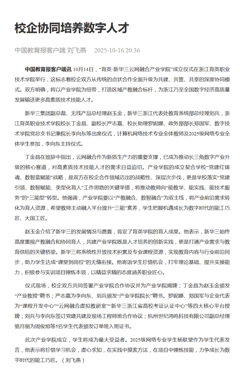 中国教育报客户端讯 10月14日,“育英·新华三云网融合产业学院”成立仪式在浙江育英职业技术学院举行,这标志着校企双方从传统的点状合作全面升级为共建、共管、共享的深度协同模式。双方明确,将以产业学院为纽带,打造区域产教融合标杆,为浙江乃至全国数字经济高质量发展输送更多高素质技术技能人才。