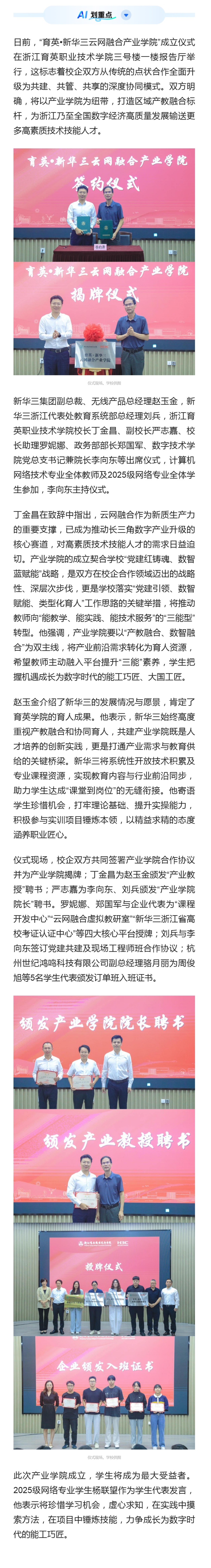 日前,“育英•新华三云网融合产业学院”成立仪式在浙江育英职业技术学院三号楼一楼报告厅举行,这标志着校企双方从传统的点状合作全面升级为共建、共管、共享的深度协同模式。双方明确,将以产业学院为纽带,打造区域产教融合标杆,为浙江乃至全国数字经济高质量发展输送更多高素质技术技能人才。