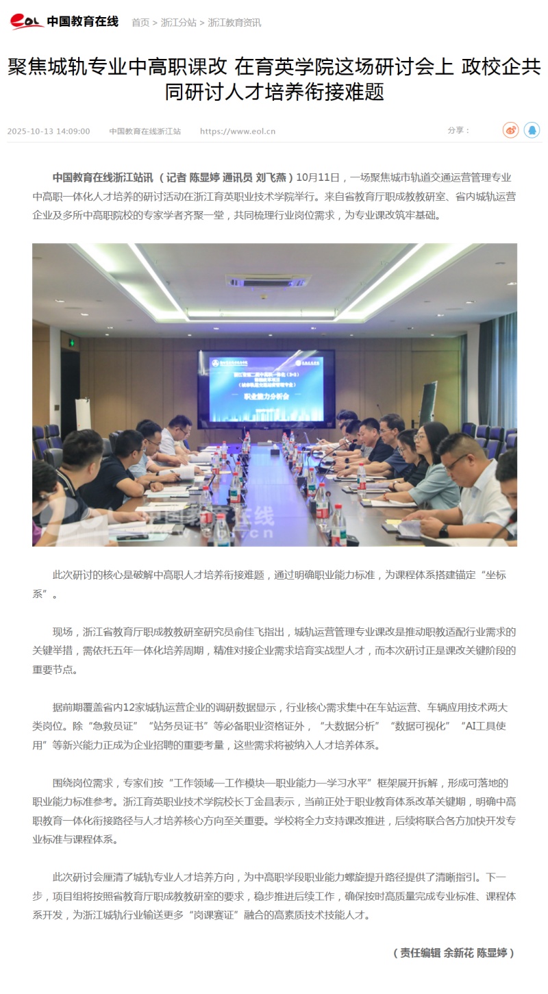 中国教育在线浙江站讯 (记者 陈显婷 通讯员 刘飞燕)10月11日,一场聚焦城市轨道交通运营管理专业中高职一体化人才培养的研讨活动在浙江育英职业技术学院举行。来自省教育厅职成教教研室、省内城轨运营企业及多所中高职院校的专家学者齐聚一堂,共同梳理行业岗位需求,为专业课改筑牢基础。