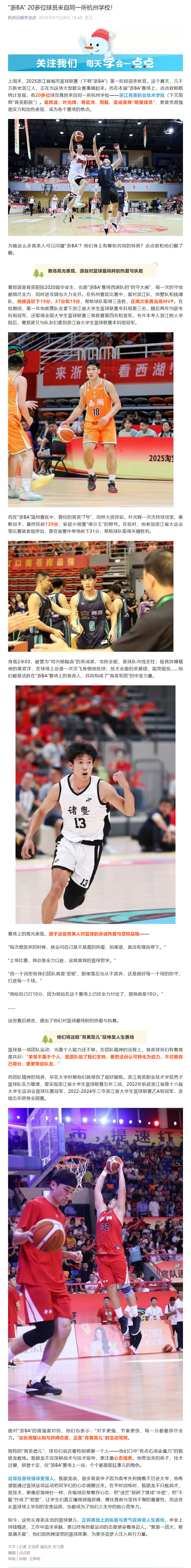上周末,2025浙江省城市篮球联赛(下称“浙BA”)第一阶段迎来收官。这个夏天,几千万新老浙江人,正在为这场大型群众赛事嗨起来。而在本届“浙BA”赛场上,点点君粗略统计发现,有20多位球员竟然来自同一所杭州学校——浙江育英职业技术学院(下文简称“育英职院”)。葛郑波、叶光辉、蒋官洋、周毅、吴成昊等“明星球员”,更是凭借强劲实力和出色表现,成为各个赛场的焦点。