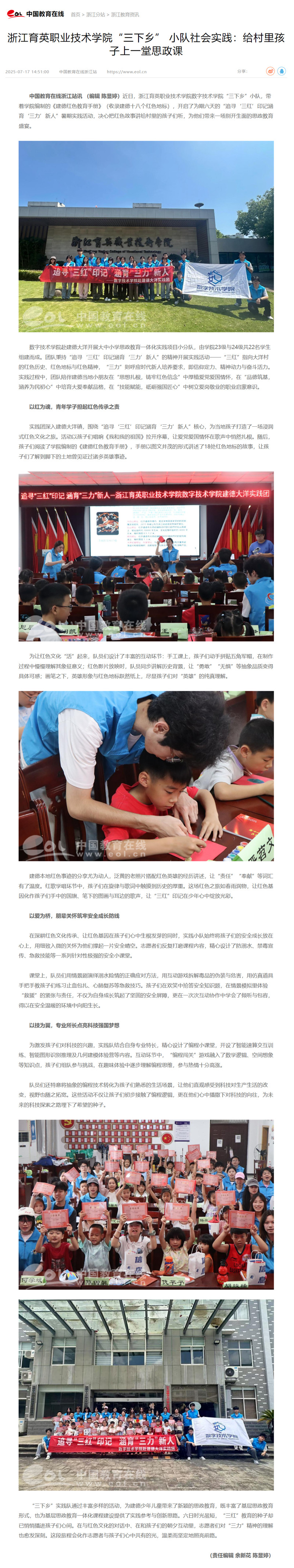 中国教育在线浙江站讯 (编辑 陈显婷)近日,浙江育英职业技术学院数字技术学院“三下乡”小队,带着学院编制的《建德红色教育手册》(收录建德十八个红色地标),开启了为期六天的“追寻‘三红’印记涵育‘三力’新人”暑期实践活动,决心把红色故事讲给村里的孩子们听,为他们带来一场别开生面的思政教育盛宴。