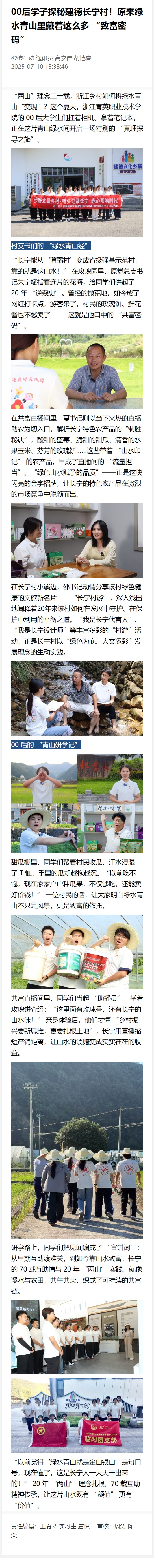“两山”理念二十载,浙江乡村如何将绿水青山“变现”?这个夏天,浙江育英职业技术学院的 00 后大学生们扛着相机、拿着笔记本,正在这片青山绿水间开启一场特别的 “真理探寻之旅”。