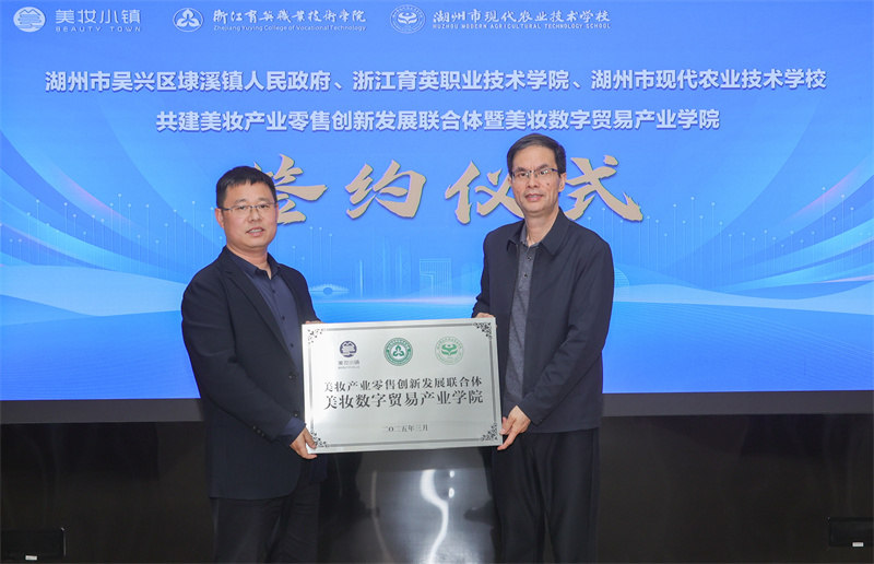 浙江育英职业技术学院向埭溪镇美妆小镇授予“美妆数字贸易产业学院”“育英-美妆小镇直播电商创业孵化基地”“美妆小镇产学研育训创合作基地”牌匾。