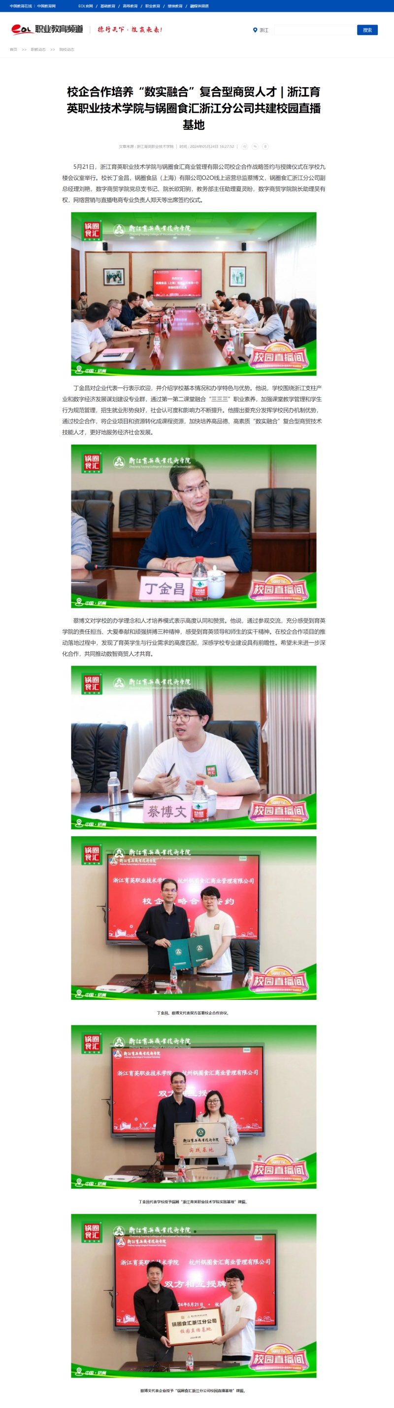 5月21日,浙江育英职业技术学院与锅圈食汇商业管理有限公司校企合作战略签约与授牌仪式在学校九楼会议室举行。校长丁金昌,锅圈食品(上海)有限公司O2O线上运营总监蔡博文,锅圈食汇浙江分公司副总经理刘艳,数字商贸学院党总支书记、院长欧阳驹,教务部主任助理夏灵盼,数字商贸学院院长助理吴有权,网络营销与直播电商专业负责人郑天等出席签约仪式。