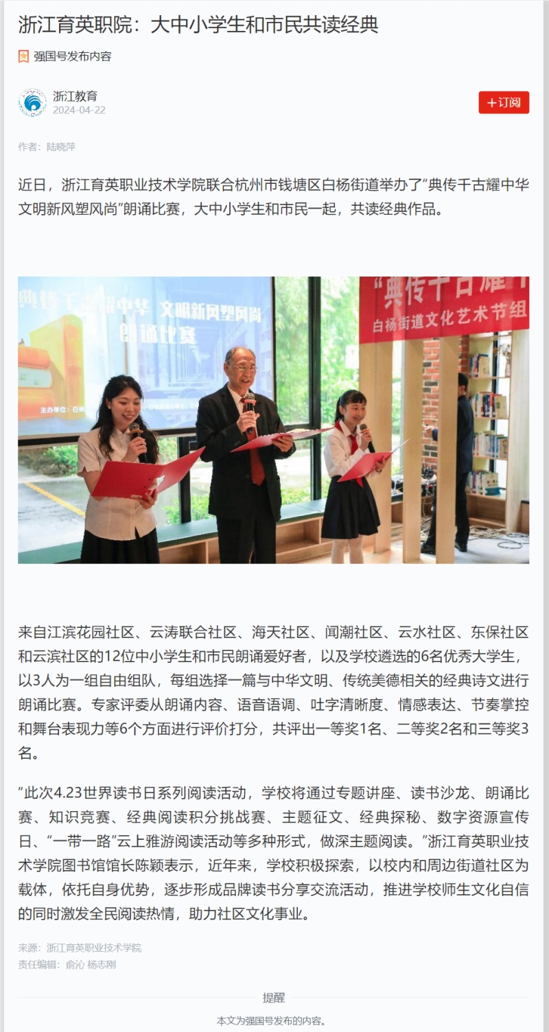 【学习强国】浙江育英职院:大中小学生和市民共读经典