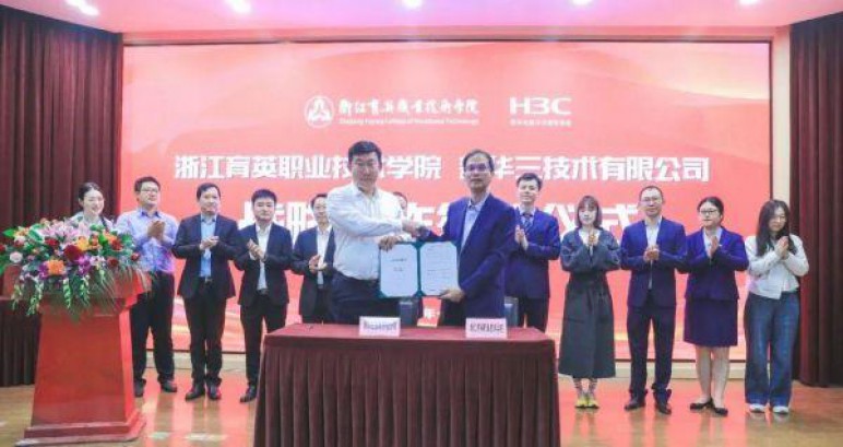 丁金昌致辞。他介绍了学校基本情况,并表示,本次战略合作签约,是学校与企业“无缝对接”,专业与产业“同频共振”,深化产教融合的实质性举措。他说,育英学院和新华三都是习近平总书记曾经视察过的单位,习近平总书记的殷切嘱托一直激励着育英人不断向前奋进。经过多年发展,学校特色和优势更加明显,所有专业紧密对接浙江省、杭州市支柱产业。自建校以来,学校坚持立德树人,主动适应市场需求,着力于培养高素质复合型技术技能人才,精心设计人才培养方案,不断深化产教融合,全面推动与头部企业全方位合作,分别成立了“育英-深信服产业学院”“育英-海尔智家智慧零售产业学院”等产教融合载体。本次与新华三合作的信息技术专业群,在专业建设、教学改革中成果丰富,尤其是赛教融合的教学特色明显,学生在各类竞赛中获得特等奖、一等奖百余项,在浙江省乃至全国具有较大影响力。新华三集团作为数字化解决方案领导者,深度布局“芯-云-网-边-端”全产业链,不断提升数字化和智能化赋能水平。校企双方可以在人才培养、实践基地建设、团队共建、课程共享、职业证书开发、党建共建等方面进行深度合作、资源共享、优势互补,达到学校、企业、学生三位一体的有机结合,最终实现三方共赢。