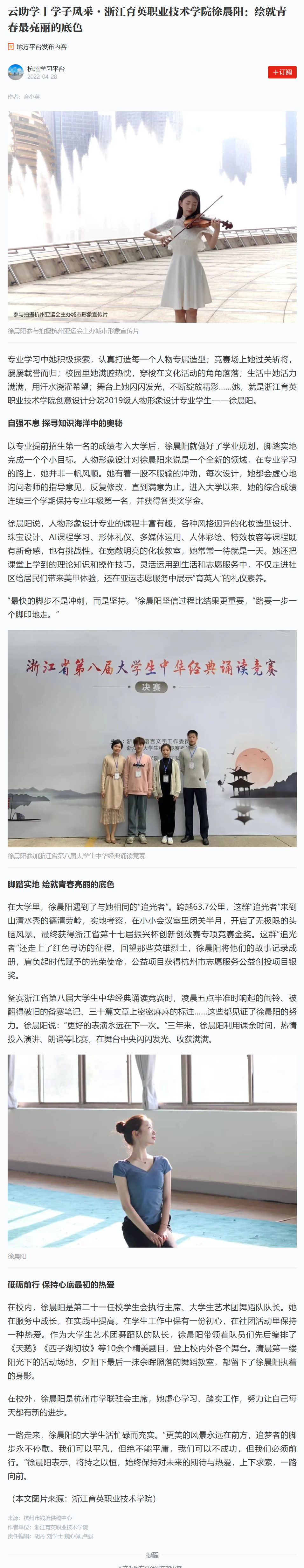 【学习强国】云助学丨学子风采·浙江育英职业技术学院徐晨阳:绘就青春最亮丽的底色