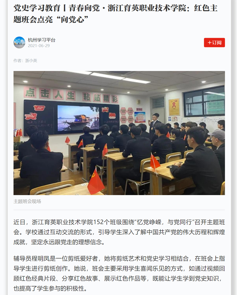 近日,浙江育英职业技术学院152个班级围绕“忆党峥嵘,与党同行”召开主题班会。学校通过互动交流的形式,引导学生深入了解中国共产党的伟大历程和辉煌成就,坚定永远跟党走的理想信念。