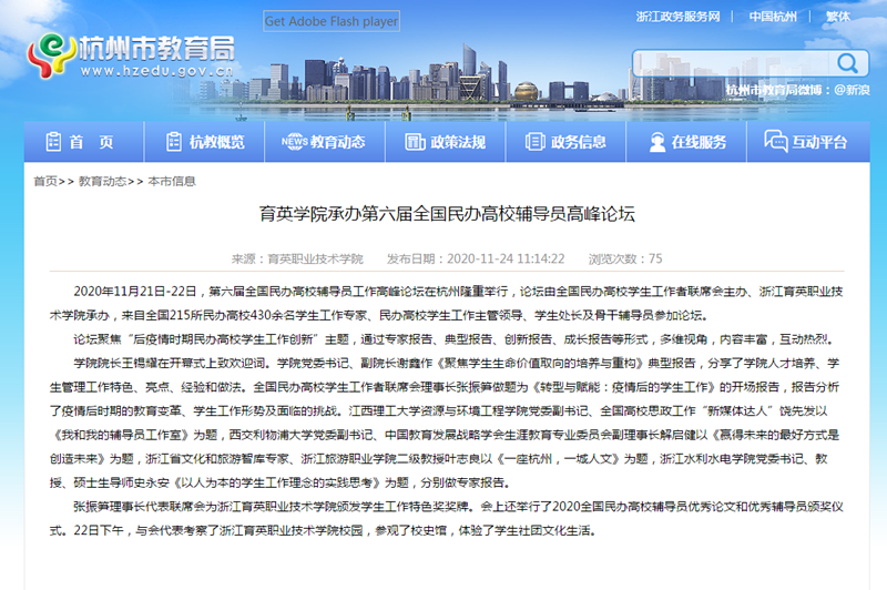 2020年11月21日-22日,第六届全国民办高校辅导员工作高峰论坛在杭州隆重举行,论坛由全国民办高校学生工作者联席会主办、浙江育英职业技术学院承办,来自全国215所民办高校430余名学生工作专家、民办高校学生工作主管领导、学生处长及骨干辅导员参加论坛。