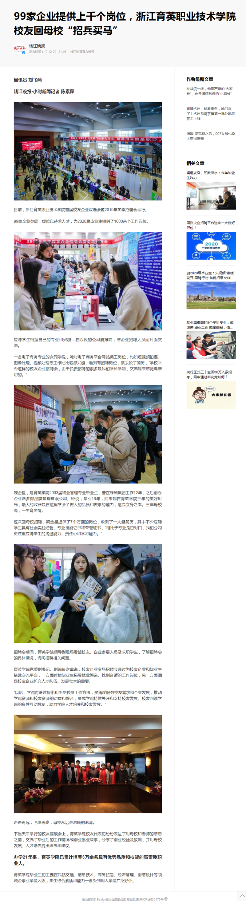 【钱江晚报】99家企业提供上千个岗位 浙江育英职业技术学院校友回母校“招兵买马”