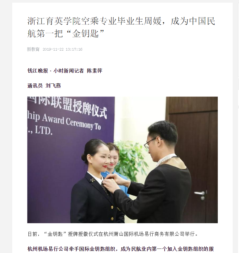 当天,易行公司员工、浙江育英职业技术学院2013届空中乘务专业毕业生周媛,通过前期培训取得了金钥匙资格证书,成为中国民航第一把“金钥匙”。