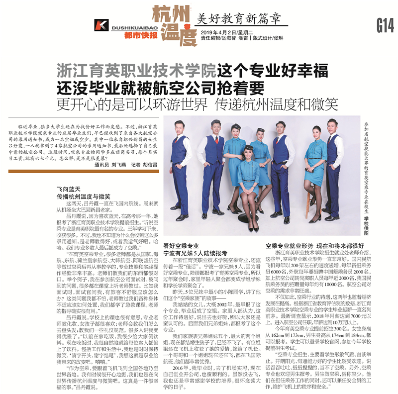 4月2日,《都市快报》第G14版报道我院空中乘务专业。讲述了空乘专业优秀毕业生的故事,引起广泛关注。