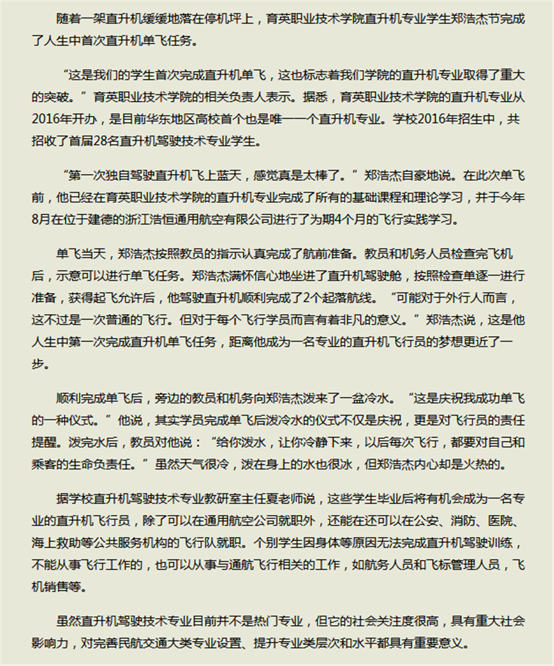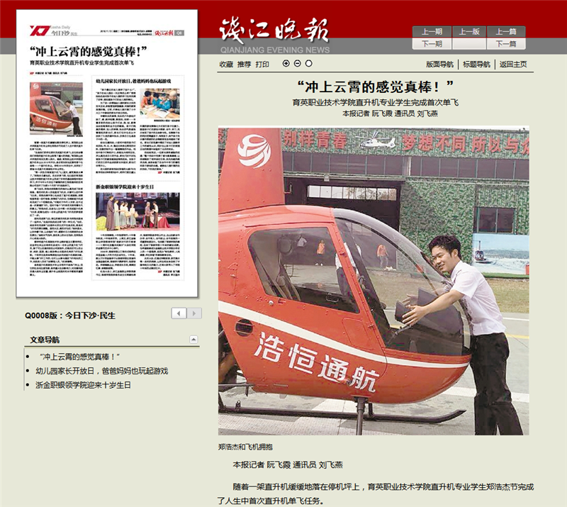 【杭州日报、钱江晚报】育英学院直升机驾驶技术专业学生首飞成功