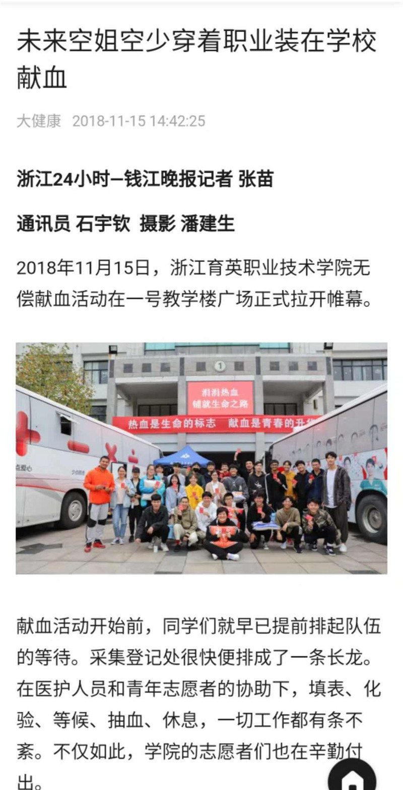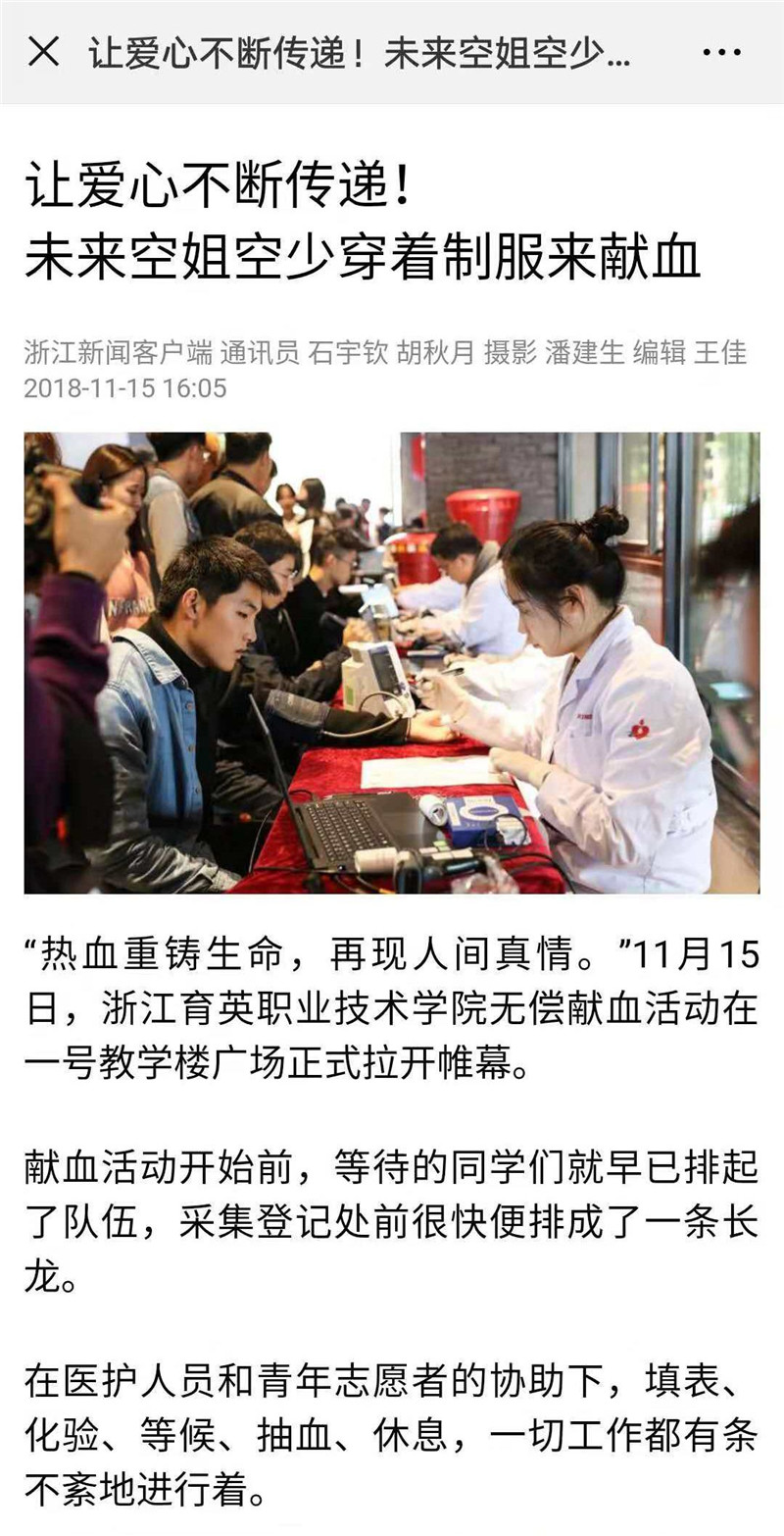 浙江育英职业技术学院院长盛健介绍,学院每年举行两次无偿献血活动,2001年至2017年,共计有11893名师生,累计献血3432530毫升。