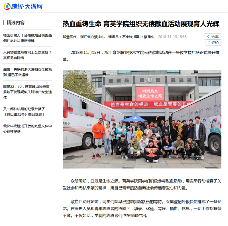 “热血重铸生命,再现人间真情。”11月15日,浙江育英职业技术学院无偿献血活动在一号教学楼广场正式拉开帷幕。