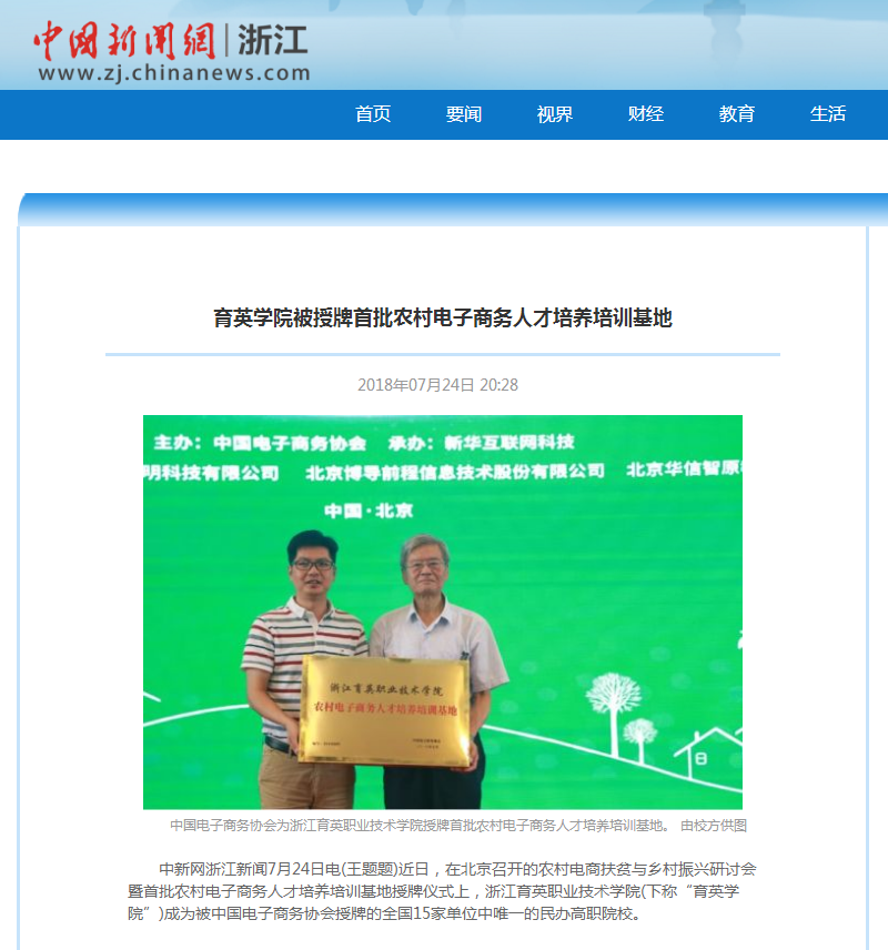 中新网浙江新闻7月24日电(王题题)近日,在北京召开的农村电商扶贫与乡村振兴研讨会暨首批农村电子商务人才培养培训基地授牌仪式上,浙江育英职业技术学院(下称“育英学院”)成为被中国电子商务协会授牌的全国15家单位中唯一的民办高职院校。