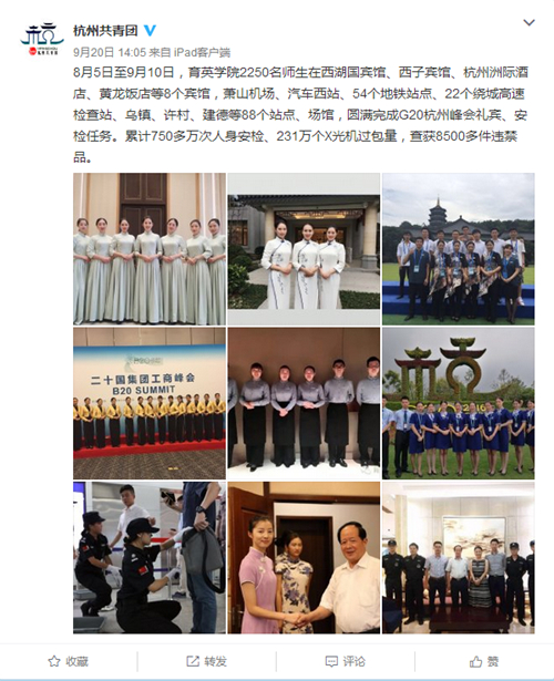 9月10日,我院最后一批服务G20的师生凯旋,育英人不辱使命,圆满完成了所有服务G20杭州峰会的礼宾和安检任务。杭州日报、浙江教育报、浙江新闻客户端、杭州网、浙江团省委头条号、杭州团市委头条号、杭州共青团微博等媒体报道了我院这次光荣而重大的任务。