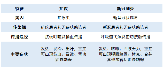 疟疾和新冠肺炎区别对照表