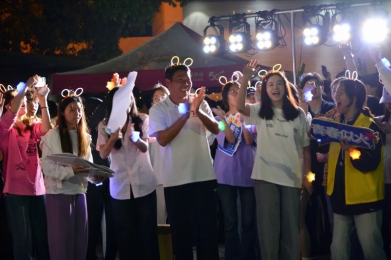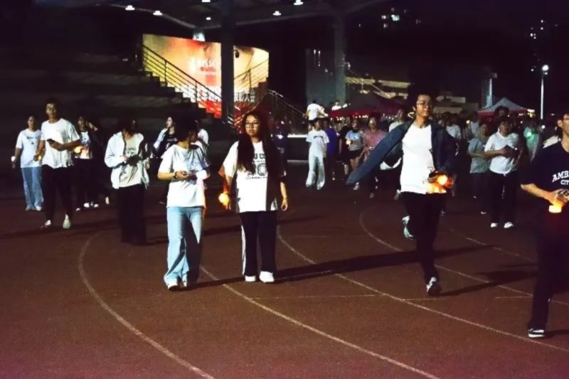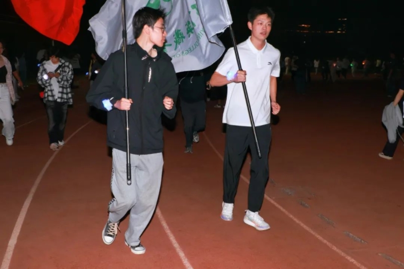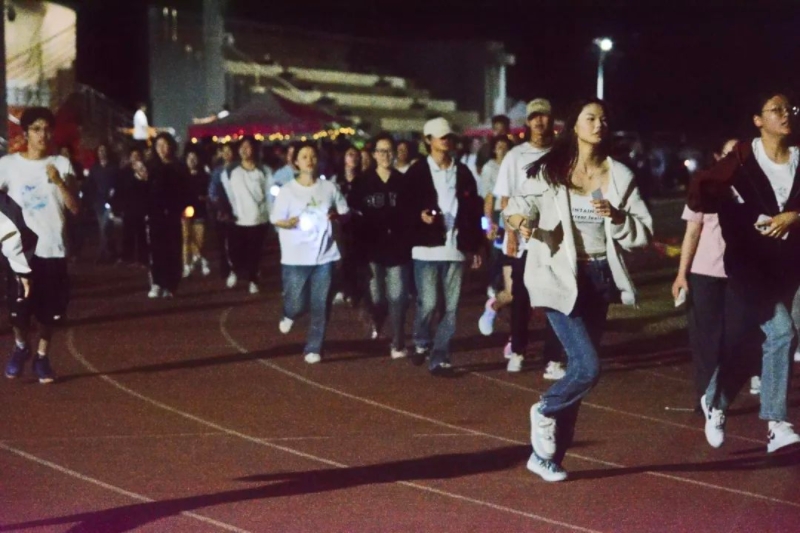 “来来来,都跟着我活动开!”社团管理中心副主任郑锦坚同学站在广场中央呼吁大家一起做跑前热身。同学们开心的跟着他一起高抬腿、原地跳,操场上翻涌起发光的波浪,在黑暗中晃成一片星海。