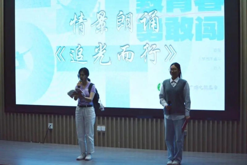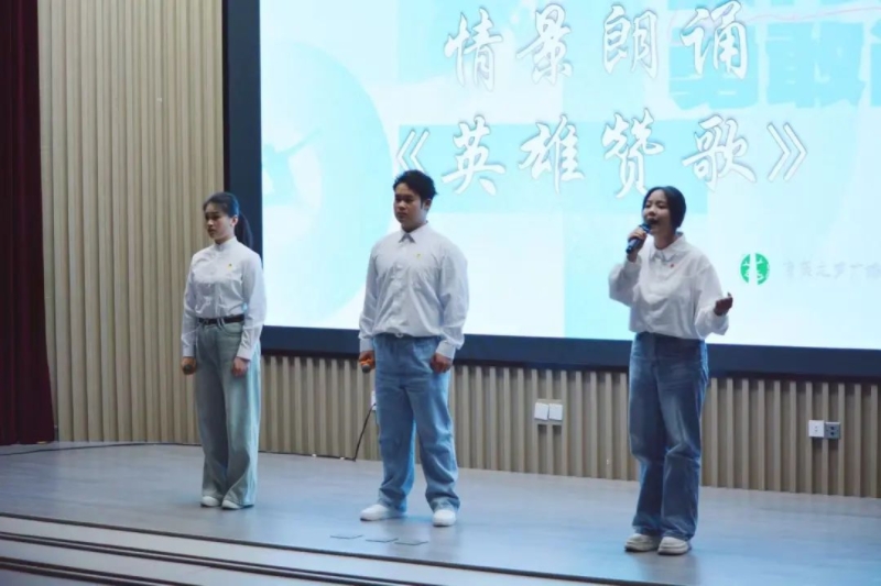 朗诵会上,守岛英雄王继才的青春为学子所传诵;《英雄赞歌》以铿锵的韵律,点燃新时代的热血;《满山红旗飘》以女生独唱和军人RAP结合碰撞出星火。声音穿越时空,我们听见——先驱者的誓言与后来者的足音在此共鸣。这不仅是纪念,更是传承:青春的中国,永远向前!