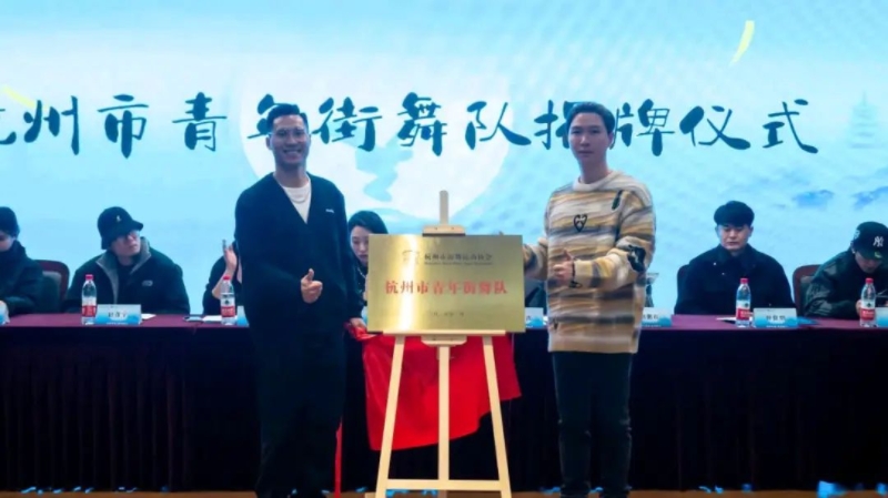 杭州市青年街舞队揭牌仪式浙江省街舞运动协会副会长兼团工委书记、杭州市街舞运动协会秘书长王红波,浙江省街舞运动协会监事长、杭州市街舞运动协会副会长刘鹏程为杭州市青年街舞队揭牌。