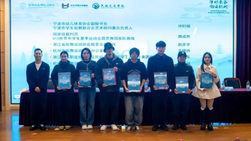 近日,杭州市街舞运动协会青年街舞队成立大会在我校举行。宁波市幼儿体育协会副秘书长、宁波市学生街舞联合会总负责仲轩熠,国家级裁判、U15世界中学生夏季运动会霹雳舞国家队教练魏成然,浙江省街舞运动协会常务理事、裁委会副主任赵彦宇,浙江省街舞运动协会理事、杭州市街舞运动协会办公室主任吴晓伟,浙江育英职业技术学院SD街舞社社团指导老师杨梦乐,杭州市街舞运动协会大学生事务委员会主任吴姝娴,浙江育英职业技术学院民航交通学院辅导员胡科佳,宁波市学生街舞联合会指导教师罗红亮参加会议。