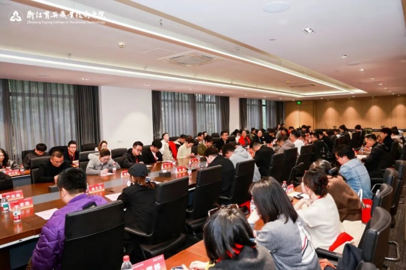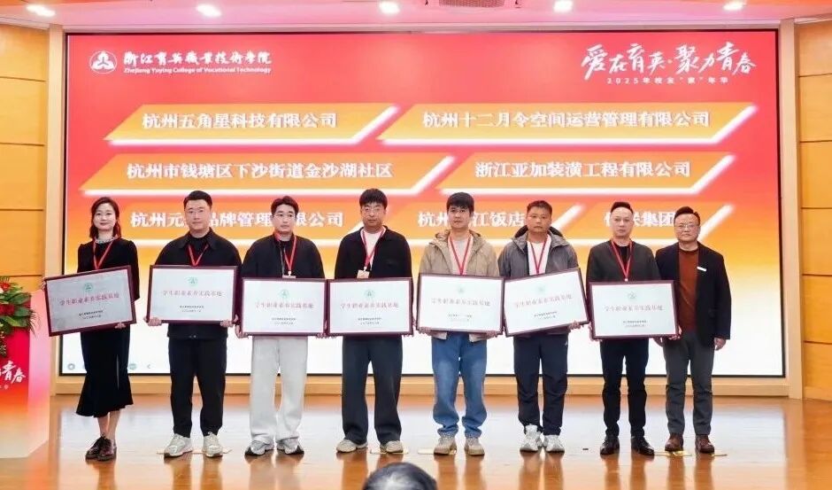 王敏为2003级计算机应用技术专业黄道笑的杭州五角星科技有限公司、2006级电子商务专业黄信的杭州十二月令空间运营管理有限公司等7家校友企业授予“学生职业素养实践基地”牌匾,搭建起校企协同育人新平台。