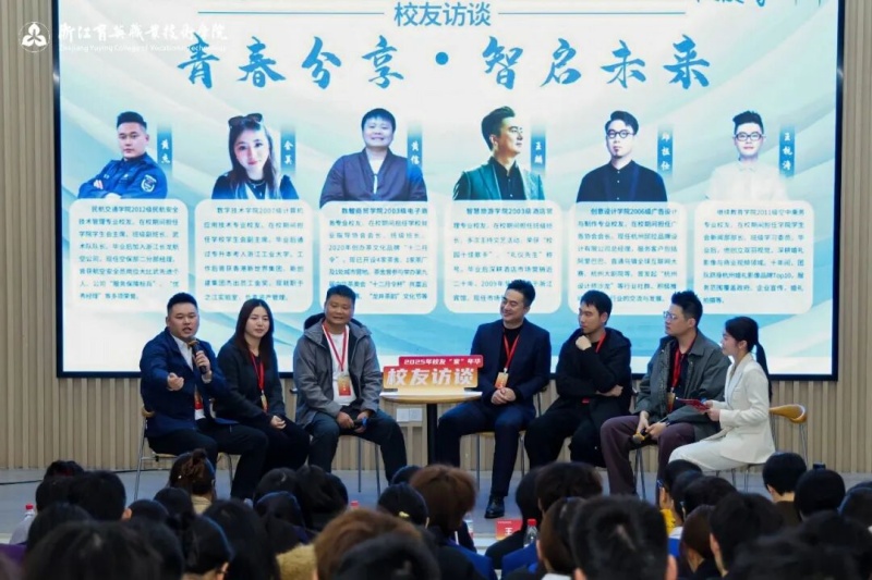 活动期间,还举行了校友成长经验分享。当天上午,“青春分享·智启未来”校友访谈在三号楼一楼报告厅举行。2012级民航安全技术管理专业黄杰、2007级计算机应用技术专业金美、2003级电子商务专业黄信、2003级酒店管理专业王麟、2006级广告设计与制作专业邱拉仕、2011级空中乘务专业王杭涛等六位校友,分别从民航从业、科研机构任职、创业实践、酒店运营、设计行业发展、传媒创业等多个维度,分享了在校期间的成长积淀与毕业后的职业探索历程。他们分享的经验让在场学子对职业发展的多元可能性有了更直观的认知。
