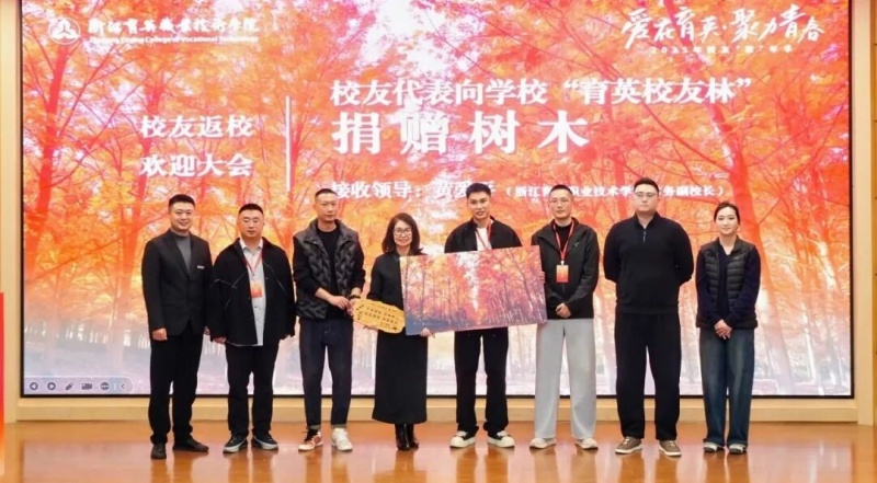 黄爱平代表学校接收“育英校友林”捐赠,2006级电子商务专业李学凌、2009级移动通讯技术专业胡斌凯、2011级环境艺术设计专业丁坚如等7名校友代表向学校“育英校友林”捐赠树木并分别发言,分享自身经历,传递对母校的思念与祝福,彰显育英精神的传承;
