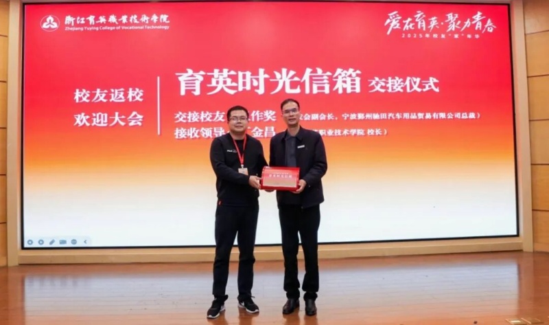 2003级市场营销专业校友温作奖代表校友将“育英时光信箱”交接给校长丁金昌,封存青春记忆,传承育英精神。