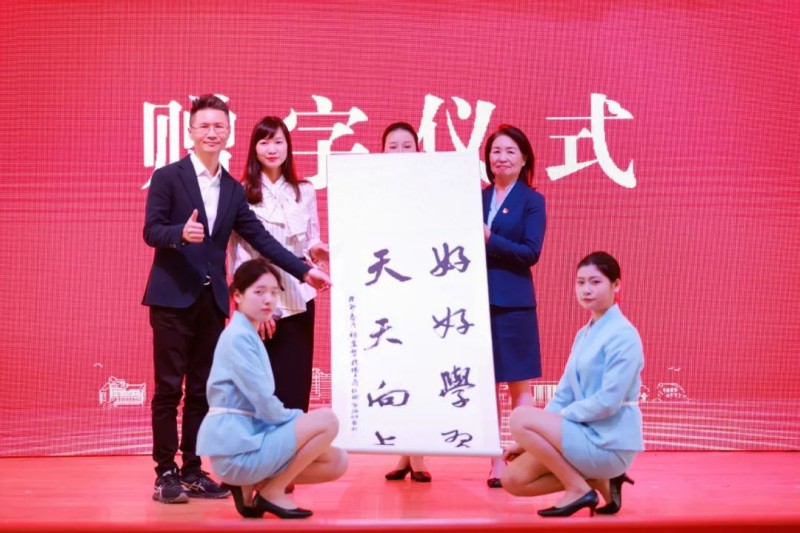 校友会常务副会长孙照和校友褚丽黎代表全体育英校友向学校赠送了书法作品。“好好学习,天天向上”八个大字,让大家牢记习近平总书记的殷殷嘱托,在自己的专业领域里有所作为,努力成为一名优秀的职业人。