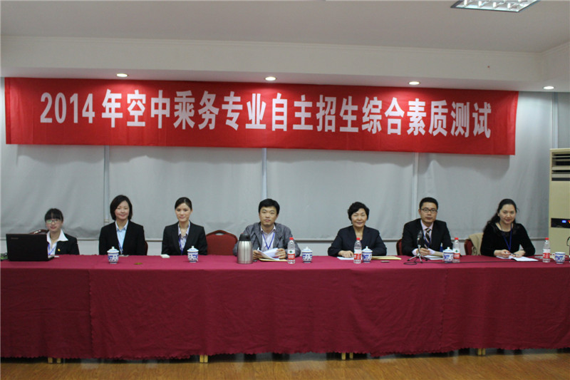 综合面试环节的考官由航空公司专家以及学院空中乘务专业教师组成,具有丰富的航空服务经验。考官们参照航空公司选拔人才的标准,主要通过考生自我介绍考察口头表达能力,通过他们的站姿、走姿和肢体语言来考察身材、气质,通过提问考察考生沟通能力、应变能力和亲和力等综合素质。