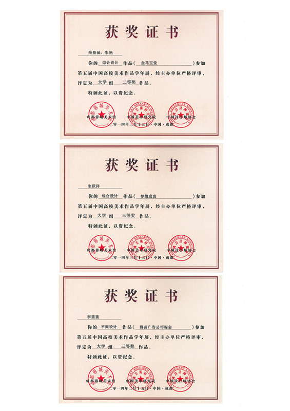 在第五届中国高校美术作品学年展中,我院13文化创意龙华班学生柴景涵、朱艳作品《金马玉堂》获美术造型类综合设计二等奖;13文化创意龙华班朱跃洋综合设计作品《梦想成真》和12广告班李苗苗平面设计作品《群苗广告公司标志》获三等奖,11名学生获优秀奖。指导教师为季海祺、郝振刚、吴良勇。