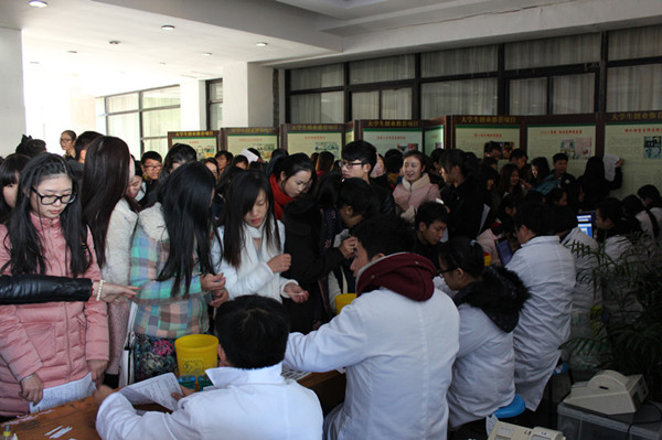 工作人员和青年志愿者辛勤付出,活动现场井然有序。服务台、各分院、系工作人员在登记处、礼品处等各个点的志愿者各司其职,更有志愿者在现场随时准备处理突发事件,为出现晕血等小症状的同学及时提供细心照料。