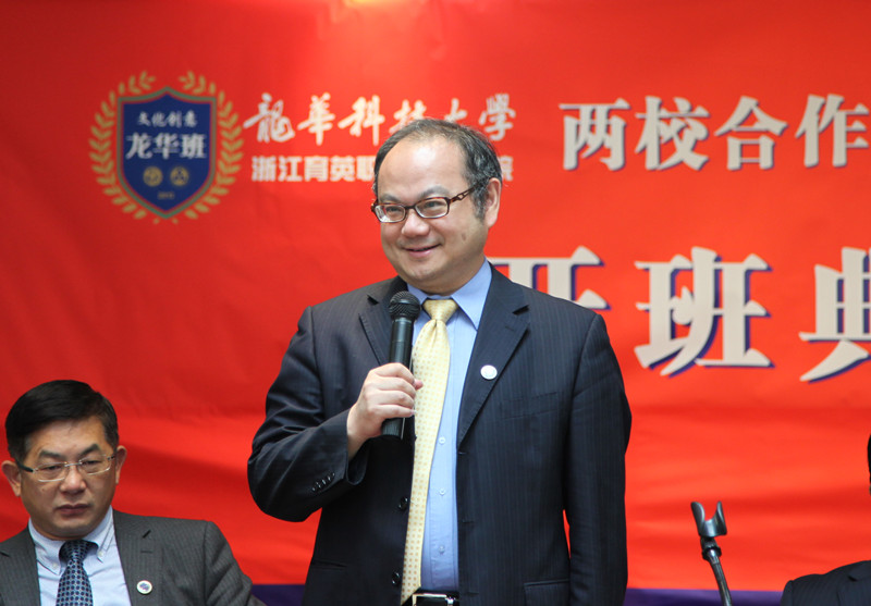 洪致平对前来参加开班典礼的葛自祥校长和龙华科技大学对育英学院的办学支持表示衷心感谢。他表达了对文化创意龙华班成立的祝贺。他说,杭州市要成为全国文化创意产业中心,将需要大量的文化创意人才。作为一所学校,最根本的就是培养社会需要的人才。文化创意龙华班是一种新的人才培养模式。相信经过三年的学习,龙华班的学生在汲取了龙华科技大学老师的创意创新思维以及育英学院老师精心设计的课程后,将会成为一批具有较强的创意精神、艺术素养和创造力的文化创意产业高素质应用型人才。希望同学们和两校共同努力,实现这一目标。
