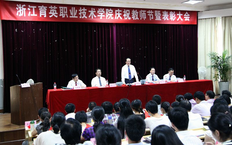 学院党委书记、院长洪致平在颁奖后发表热情洋溢的讲话。他首先向全体教师致以节日的祝贺,特别对受到表彰的杭州市师德标兵、优秀教师、优秀教育工作者以及由学生民主选出的“我最喜爱的教师”表示热烈祝贺。他强调了教师职业发展的重要性,强调教师要学会做人、做事和做学问,让责任伴随一生。他深情地勉励全体教师,特别是新获得高职称证书的6位教师、新近获得高校教师资格证书的14位教师以及第一次过教师节的教师们,要牢记教师的职责和使命,自觉践行黄纪云董事长提出的“教育是崇高的服务”号召,在以后的工作实践中以身边这些师德标兵、优秀教师、优秀教育工作者为榜样,虚心学习,在学院全心全意为教师服务的基础上,做到教师全心全意为学生服务,在平凡的教师岗位去实现个人的职业价值、人生价值和学院发展的社会价值统一,努力为办人民(学生、家长、社会)满意的高职教育、为实现美好的未来做出自己的贡献。