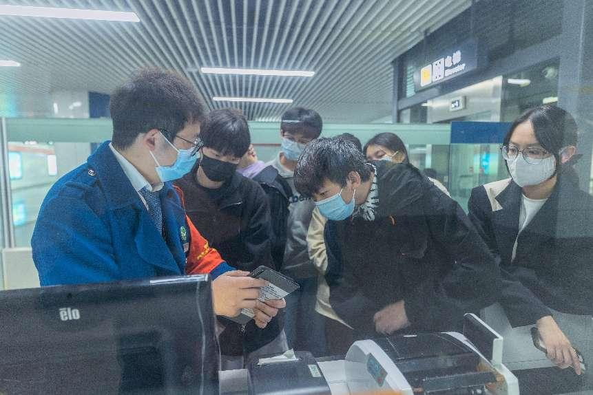在陈区的带领下,同学们参观了整个武林门车站,了解了车站结构、车站设备、车站运作生产方式、换乘方式及各个岗位工作任务,体验了车站票厅岗售票员工的岗位,感受了如何发售单程票,现场操作了闸机、自动售票机设备的结算换票作业。