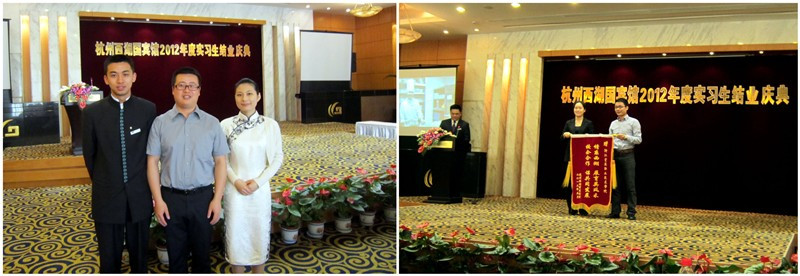 西湖国宾馆作为国家、省、市领导重要的接待场所,承担各级领导接待的任务,接待规格高、服务要求高。2012年6月,我院第一批实习生前往国宾馆实习,分院就实习学生管理安排朱尧老师专门负责,并成立党章学习小组,在实习过程中我们的学生政治可靠、业务熟练、素质过硬,得到用人单位的高度评价,西湖国宾馆送给我院“情系西湖,展育英风采,校企合作,谋共同发展”的锦旗,这是我院在校企合作中成功的实践,也充分展现了"职业人"培养的成效。