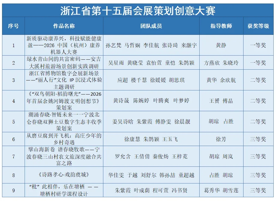 近日,浙江省第十五届会展策划创意大赛落下帷幕,我校智慧旅游学院学生获一等奖2项,二等奖3项,三等奖4项。此前智慧旅游学院学生已连续三年在该赛事中获得一等奖。