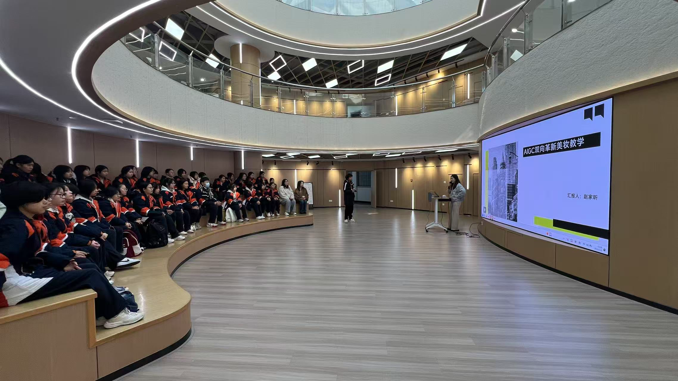 午餐过后,系列专题分享活动准时开启。我校盛乐老师围绕“中高职一体化人才培养模式”展开介绍,详细解读了中高职衔接的课程体系架构、培养目标差异化设定、升学考核标准等核心内容。盛老师结合我校人物形象设计专业的一体化培养实践经验,用通俗易懂的语言讲解了从中职基础技能夯实到高职专业深化的培养路径,让学生们对未来的学习规划有了明确方向。