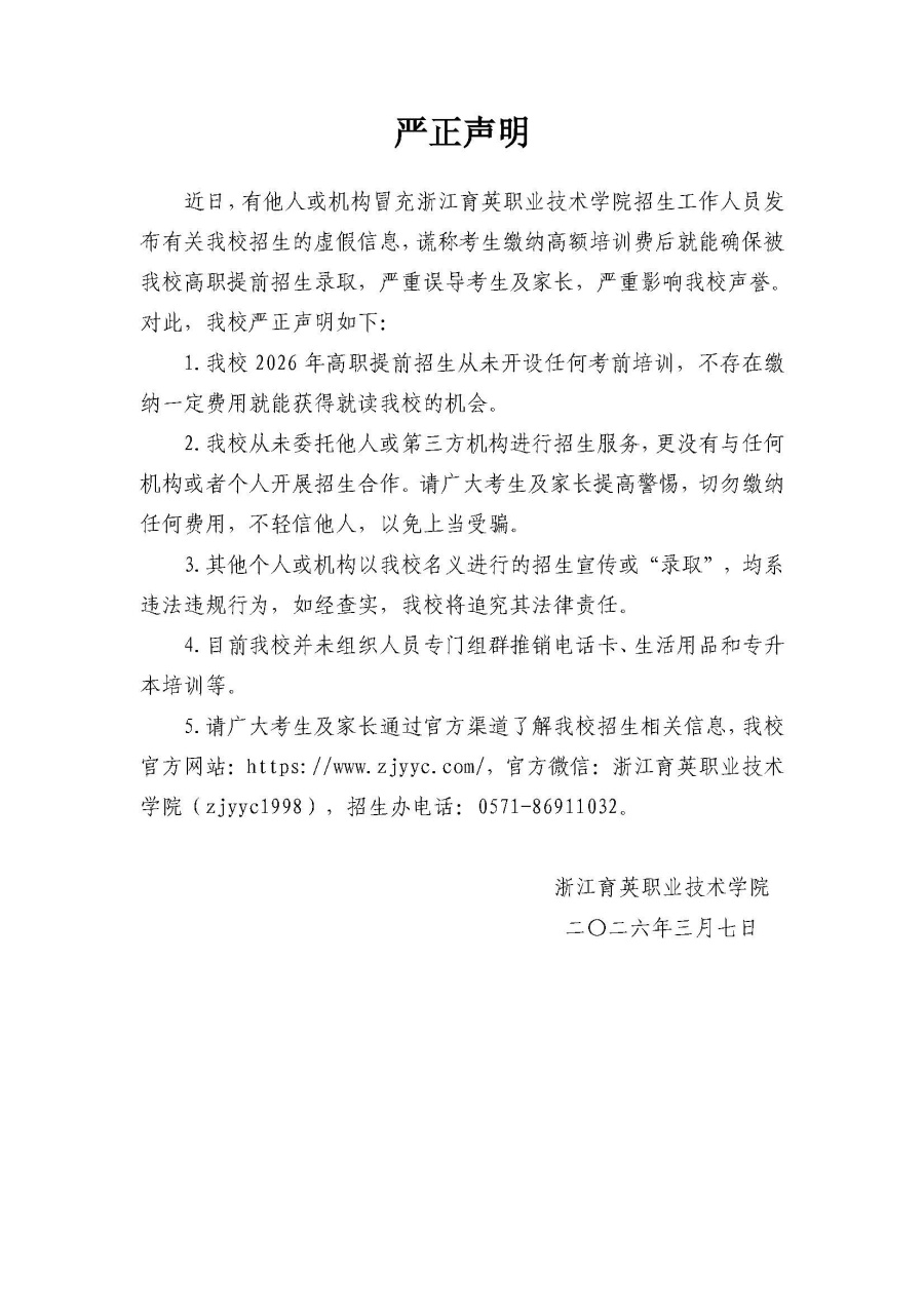 招生咨询 招生公告 报考指南 提前招生 历年分数 2025年招生专栏 录取查询 在线咨询 联系我们 地址:杭州市钱塘区4号大街16号 邮编:310018 电话:0571-86911032、86877189 招生公告 当前位置:首页 >> 招生咨询 >> 招生公告 严正声明 时间:2026-03-07