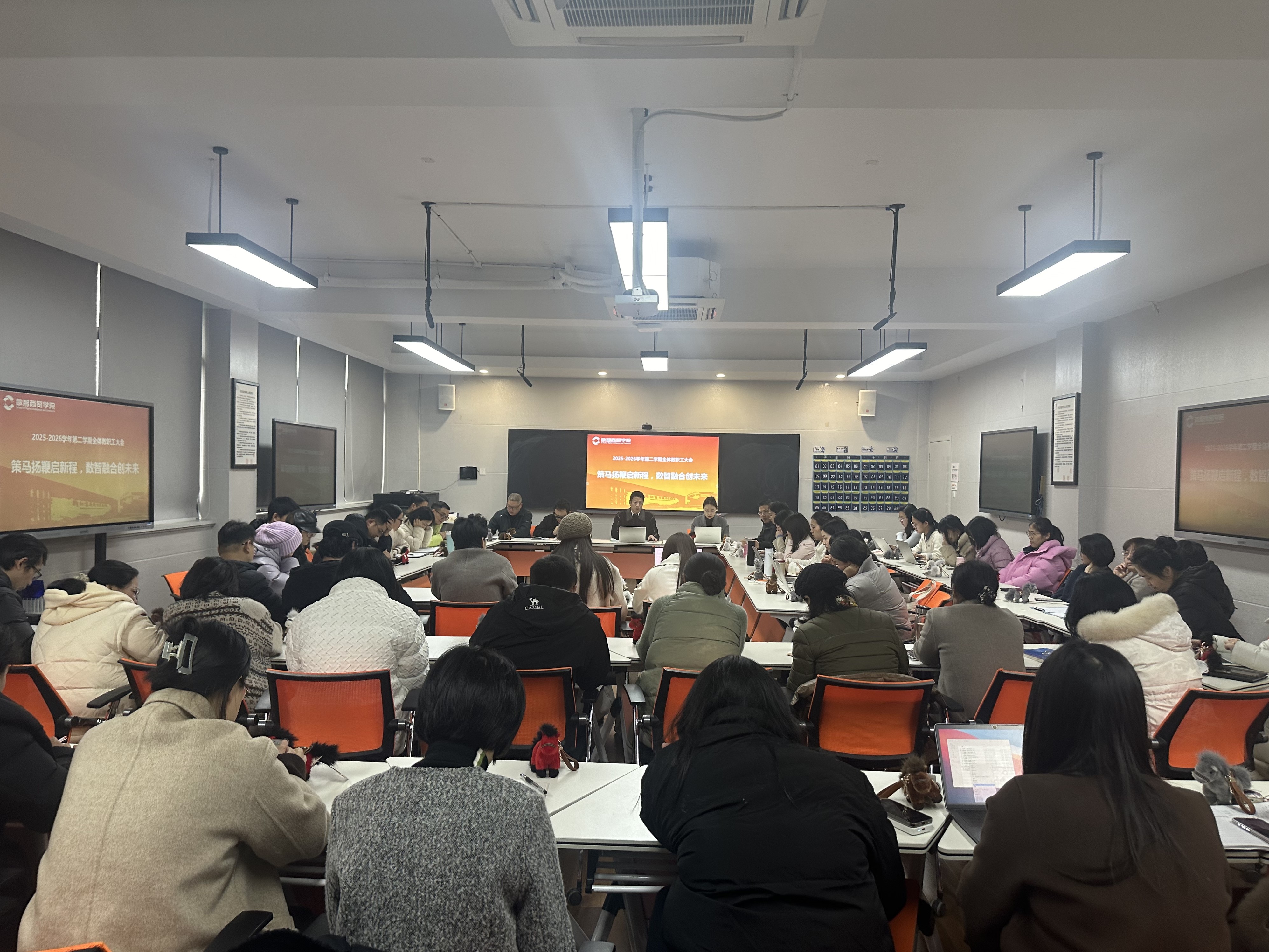 2026年3月3日下午,数智商贸学院新学期全体教职工会议在3213智慧教室召开。学院党总支书记、院长欧阳驹,副院长章雁峰、吴有权、党总支副书记、院长助理孙钦及全体教职工参加,会议由综合办主任王成伟主持。