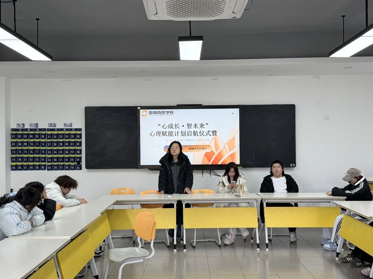 为帮助学生缓解开学焦虑,增强心理委员履职能力,搭建朋辈心理互助桥梁,2026年3月10日 13:30,数智商贸学院心理辅导站在3309教室启动“心成长智未来”心理赋能计划,开展首期“遇见新学期联结新自我”心理破冰工作坊。学院心理辅导站梅青青老师担任活动负责人,全院各班心理委员参与本次活动。